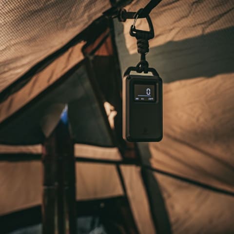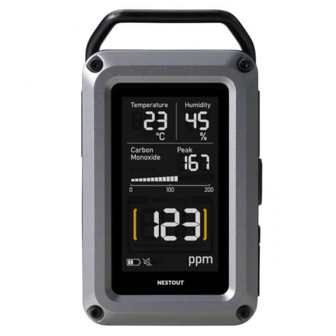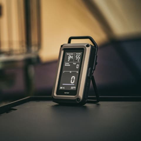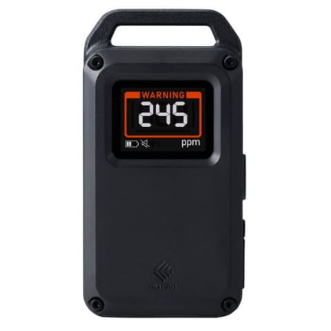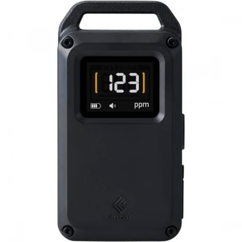 炭火やストーブ、発電機などから発生する一酸化炭素(CO)を検知し、アラームで知らせて一酸化炭素中毒を未然に防ぐための機器。テントやタープ、車内といった、アウトドアシーンで使うことに特化したデザインを採用する。