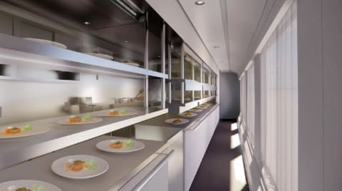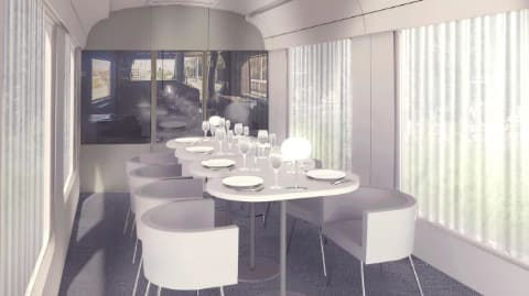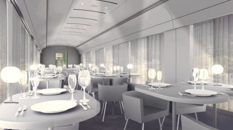 新造車両は、西武鉄道の特急電車「Laview」(ラビュー)がベースで、独創的な建築で世界的に評価されている建築家の妹島和世氏がデザイン。鏡のように輝く車体が特徴になる。また、厨房車両は70名程度の乗客に温かい料理を熱々のまま提供できるよう、厨房面積を広く取った「日本一の厨房車両」になる予定。