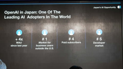 ブループリントでは、日本の経済成長におけるAIの重要性について、「100兆円を超える経済価値を生み出す可能性がある」と言及している。日本のChatGPTのアクティブユーザーは、前年から4倍の成長を見せており、ビジネスユーザーの数は米国に次ぎ2番手、有料会員数は世界4位、開発者市場は世界5位とOpenAIのなかでも大きな位置を占めているという。