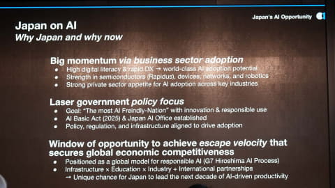 それ故に、初の米国外拠点として日本が選ばれたが、加えて政府のイノベーションを後押しする姿勢や、初の女性首相となる高市首相の誕生に言及し、変化を受け入れ力に変えていく日本において、「AIはその原動力になる」とする。