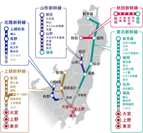 那須塩原、新白河、郡山、福島、白石蔵王上越新幹線