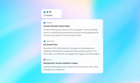 たとえば、クライアントとの会議前には、Slackのチャンネル投稿やメール、過去の議事録、サポートチケットなどをもとにしたブリーフィング資料の作成が可能。また、「来期の会社目標は?」といった曖昧な質問に対しても、複数の情報源をもとに見解の整理や進捗の違いをまとめて回答する。