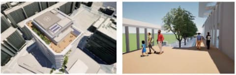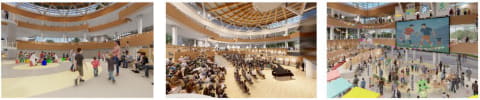 低層部に中広場、外広場、階段広場で構成される市民広場、18階に展望施設を設置。中広場は天候に左右されない屋内広場で、大型ビジョンやロールバックチェアを備える。階段広場は地上とデッキをゆるやかにつなぐ多機能階段で、キッチンカーを入れることもできる。外広場は屋根付回廊に囲まれた新庁舎のエントランス広場。展望施設は回廊状に全周を見渡せる設計とする。