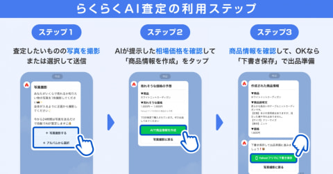 トークルーム下部の「らくらくAI査定」をタップ後、写真撮影またはアルバムから選択して送信。表示された相場価格を確認し、提案された商品情報を下書きとして「Yahoo!フリマ」アプリに保存できる。保存後はアプリから出品作業を続けられる。