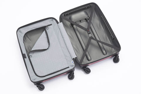 最大サイズの103Lモデルでは、受託手荷物の国際基準である3辺合計158cm以内に対応しつつ、大容量を実現。内装には荷崩れ防止ベルトやファスナー付き仕切りを備える。