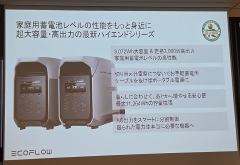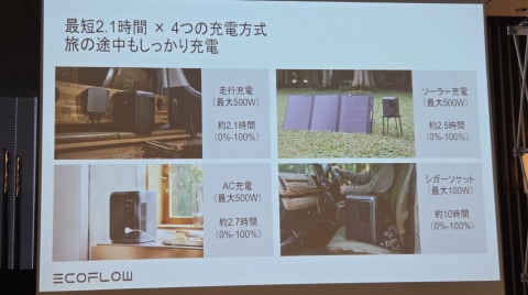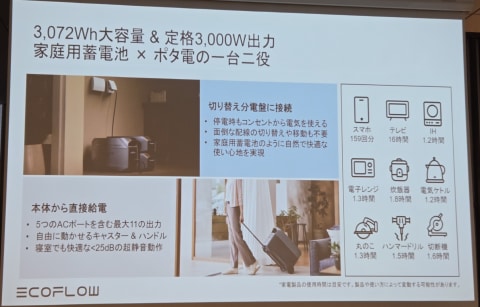 重量は10kgで、従来比約30%の小型・軽量化を実現するほか、フラットな本体設計のため、横置き利用にも対応する。小型軽量のため、持ち運びやすく、省スペースで長時間使用できるポータブル電源として、アウトドアや防災など幅広いシーンでの活用を狙う。プラスチックの難燃性を評価する基準についても、もっとも厳しい「UL94-5VA」に準拠。EV技術由来の「Cell to Chassis(セル・トゥ・シャーシ)」構造やバッテリーマネジメントシステム(BMS)を備え、高い安全性と堅牢性を追求している。