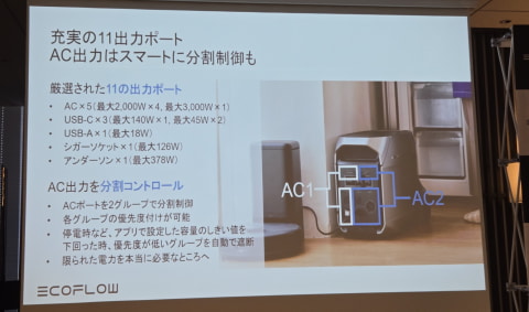 DELTA 3 Ultra Plus特有の機能に、バッテリー拡張とAC分割制御がある。エクストラバッテリー (拡張バッテリー)と組み合わせることで、最大11,264Whまで拡張できる。AC出力は2系統に分かれており、用途に応じた電力制御が可能。系統ごとに優先度を付けられるため、停電時などに優先度が高い家電などに自動で割り振れる。