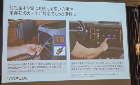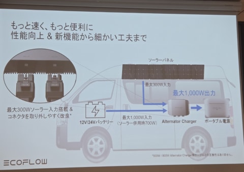 さらに車載充電器のAlternator Charger 600、Alternator Charger Plus 1000も発表された。Alternator Charger Plus 1000は最大1,000Wの高出力に対応し、1時間で1,000Wh充電できる。また、ソーラーパネルからの直接入力(最大300W)にも対応。ソーラー電力を活用して車両側のメインバッテリーへの逆充電も可能となるため、停車中でも急速充電を維持できるとしている。Alternator Charger 600は既製品のAlternator Charger 500の後継モデルで最大600Wで充電できる。