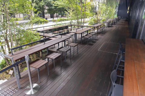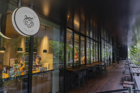 TORANOMON MARCHÉは、赤坂・虎ノ門緑道至近の1階オープンテラスに位置し、11時30分から22時まで営業。昼はランチ、夜は友人とのコミュニケーションの場として利用できるほか、休日も営業する。また、ワーカーのタイムパフォーマンスを考慮し、モバイルオーダーを導入している。