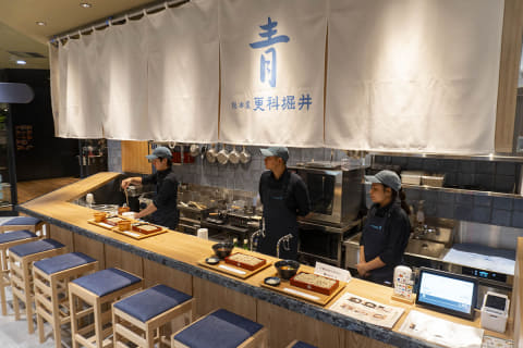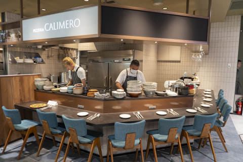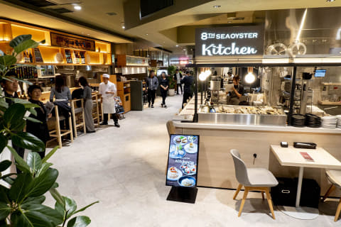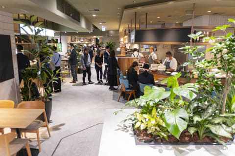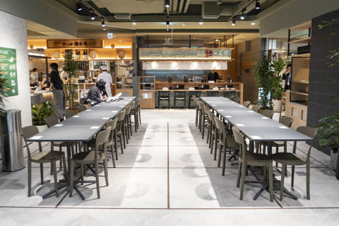 各店舗の座席のほか、共用席、テラス席も設置。また、一部の店舗にはオープンキッチンや外のテラスに面したテイクアウトカウンターを設けた。