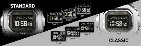 アプリ連携によりメイン表示のフォントを「STANDARD」から、クラシカルな7セグメントフォントの「CLASSIC」に切り替えられる。基本時計表示をボタン操作で切り替えられ、液晶上部の表示部分は、2都市時刻同時表示、日付+曜日、年+日付+曜日、3都市時刻同時表示の4種類が用意されている。