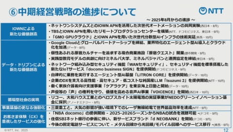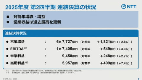 NTTは、2025年度第2四半期決算を発表した。自動運転事業を加速させる子会社の設立やNTTドコモの事業強化といった話題にも触れられている。