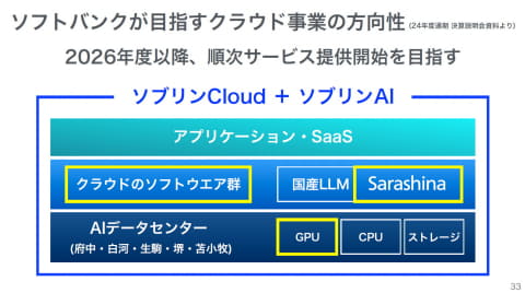 ソフトバンクはクラウド事業として「ソブリンCloud+ソブリンAI」の方針を発表しており、クラウドのソフトウェア群ではオラクルと取り組むことや、独自に開発する生成AIのLLM「Sarashina」、AIデータセンターを建設してGPUによる「AI計算基盤」を構築するといった取り組みが説明された。