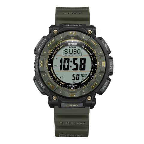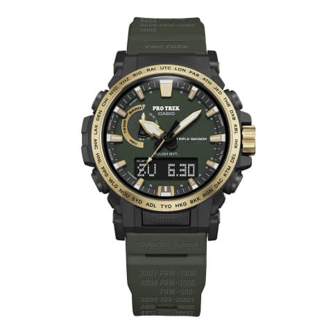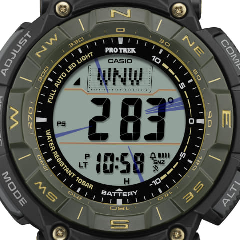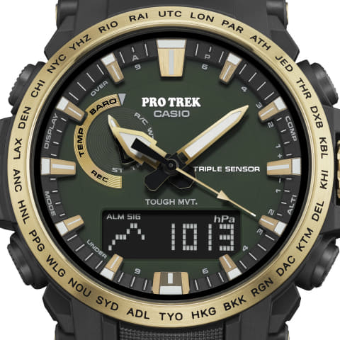 -10℃までの耐低温仕様で、防水性能は10気圧防水。トリプルセンサー搭載で気圧計測、高度計測、温度計測が可能。ワールドタイム、方位計測、日の出日の入り表示、ストップウォッチ、タイマー、時刻アラーム、バッテリーインジケーター表示、パワーセービング、フルオートカレンダー、12/24時間制表示、操作音ON/OFF切替、LEDバックライトの各機能を搭載する。本体サイズは54.7×51.7×15.1mm、重量は62g。