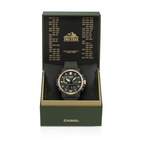 ブランドコンセプト「One with Nature」を象徴するという「森の木漏れ日」をテーマにしたプロトレック30周年記念モデル。自然や光を表したグリーンとゴールドを基調に、ゴールドIP加工を施したメタル遊環や、バンドに刻まれた歴代モデル名、裏蓋の30周年ロゴなど、記念モデルならではの特別仕様になっている。ケースやバンドはバイオマスプラスチック製。