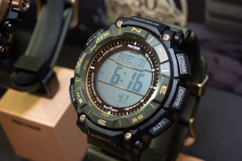 PRG-340ANSは、コンパスの方位を画面に重ねて表示できる二層構造の「デュプレックスLCD」を採用するデジタルモデル。記念カラーをまとい、スリムなケースデザインも特徴。ソーラー発電に対応する。
