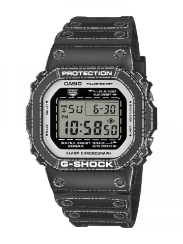 DW-5600RGM-1JRは、耐衝撃構造で20気圧防水。ストップウォッチ(1/100秒)、タイマー、マルチアラーム、フルオートカレンダー、12/24時間制表示切替、LEDバックライト、報音フラッシュの各機能を搭載する。クオーツ式ムーブメント(モジュールNo.3525)を搭載し、精度は月差±15秒。電池寿命は約5年。本体サイズは48.9×42.8×13.4mm(縦×横×厚さ)、重量は53g。
