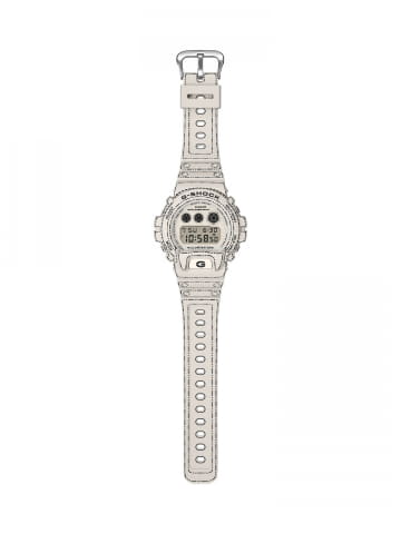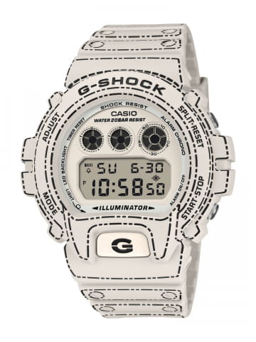 DW-6900RGM-5JRは、耐衝撃構造で20気圧防水。ストップウォッチ(1/100秒)、タイマー、マルチアラーム、フルオートカレンダー、12/24時間制表示切替、LEDバックライト、報音フラッシュの各機能を搭載する。クオーツ式ムーブメント(モジュールNo.3529)を搭載し、精度は月差±15秒。電池寿命は約5年。本体サイズは53.2×50×18.7mm(縦×横×厚さ)、重量は67g。