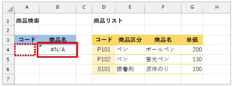 「#N/A」は、検索対象の値が見つからないことを示すエラーです。VLOOKUP関数、XLOOKUP関数、MATCH関数といった検索系の関数でよく表示されます。たとえば、下の図ではセルB4にVLOOKUP関数を入力し、セルA4に入力した「コード」を「商品リスト」の表から検索し、該当する商品名を取り出しています。