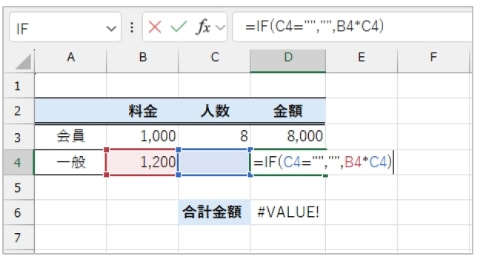このエラーの原因は、D列の「金額」のセルに入力している数式にあります。IF関数を使って、「人数」が未入力のときには、「""」(ダブルクォーテーションを2つ)を指定して空白を返しています。この「""」(ダブルクォーテーションを2つ)で表す空白は、文字列として扱われるため、「#VALUE!」が発生したのです。