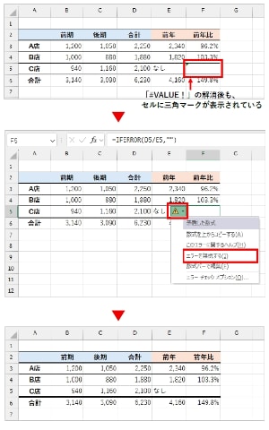 エラーを解消しても、セルの左上に三角マークが表示される!