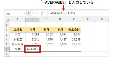「#NAME?」が表示されるのは、数式で使っている名前に原因があるときです。たとえば、下の図ではAVERAGE関数で平均を求めていますが、最後に不要な「E」があるために「#NAME?」が表示されています。
