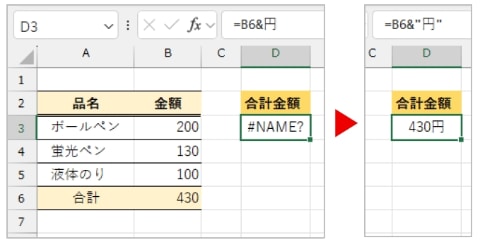 また、数式中で文字列を""(ダブルクォーテーション)で囲み忘れたときにも、「#NAME?」が表示されます。これは、未定義の名前と解釈されるためです。もし、関数名などの名前に入力ミスがないときは、このような原因を探ってみましょう。