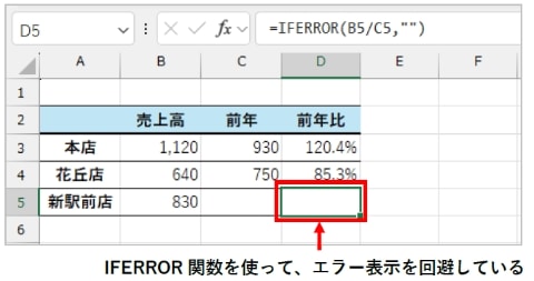 Excelで割り算は「/」で示しますよね。「#DIV/0!」は、数式で「0」または空白のセルで割っているときに表示されます。たとえば、下の図で「前年比」は、「売上高÷前年」を計算して求めています。セルD5には「=B5/C5」を入力していますが、セルC5が空欄のために「#DIV/0!」が表示されています。