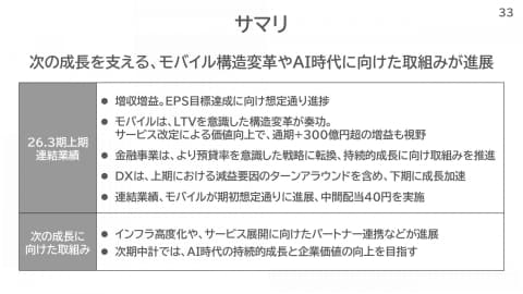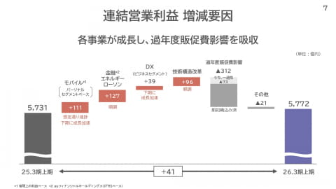 これは、料金改定の効果が顕在化し、モバイルや金融、DXなど各事業が成長したためであり、過年度の販促費影響を吸収しながら、通期でのEPS目標達成に向け想定通りに進捗していると同社は説明した。