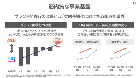 モバイルARPUも堅調に上昇し、スマートフォン解約率も改善している。ブランド間移行ではUQ mobileからauへの移行が9月にプラスへ反転し、10月もこの流れが続いている。短期特典に依存する販売を見直し、長期利用と価値訴求を重視した方針転換が功を奏したといい、モバイル事業ではサービス改定による価値向上も含めて通期で300億円超の増益を見込む。