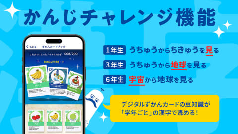またアプリには、高学年まで使える「学び機能」を搭載。これまでは、ひらがなのみの対応だった専用アプリの「デジタルずかんカード」に、学年に応じた漢字に切り替えられる「かんじチャレンジ」機能を追加した。アプリアップデートは12月上旬予定。