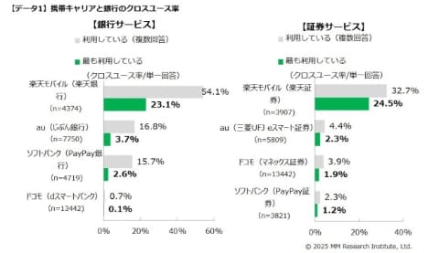 MM総研は5日、携帯キャリア4社が自社グループで提供する銀行および証券サービスの利用状況の調査結果を発表した。楽天モバイルが銀行・証券ともに首位を維持し、楽天モバイルユーザーの23.1%が楽天銀行をメイン口座として利用し、24.5%が楽天証券を最も利用している。