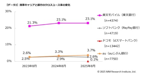 このほかのクロスユース率は、ソフトバンクのPayPay銀行が2.6%、NTTドコモのdスマートバンクが0.1%。なお、NTTドコモは10月よりd NEOBANKを提供開始しており、今後の巻き返しを狙っている。