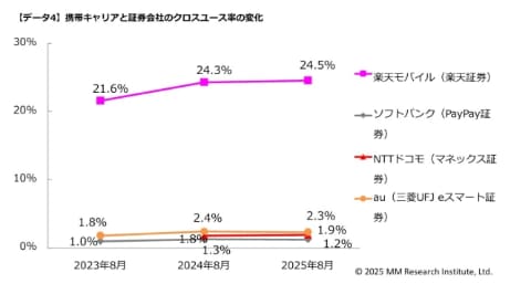 携帯キャリアと証券サービスのクロスユース率でも、楽天モバイルユーザーの楽天証券とのクロスユース率が24.5%と首位を守った。楽天証券の利用率は、auで1位、ドコモやソフトバンクでも2位となっており、キャリアを超えて支持を広げる。