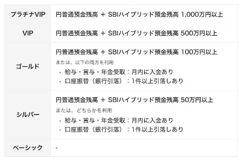 ランクは「プラチナVIP」「VIP」「ゴールド」「シルバー」「ベーシック」の5段階。ランクの判定は、判定対象月の月末時点の「円普通預金残高」と「SBIハイブリッド預金残高」の合計、または判定対象月の給与・賞与・年金受取と口座振替(銀行引落)の利用状況に応じて決定する。