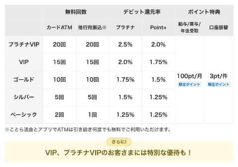 ランクに応じて、カードATM無料回数は2~20回(アプリでATMは無料)、デビット還元率は1.25~2.5%など変更され、VIPとプラチナVIPにはさらに特典が用意される。これに伴い、従来のビットカードポイント還元率アッププログラムは終了する。