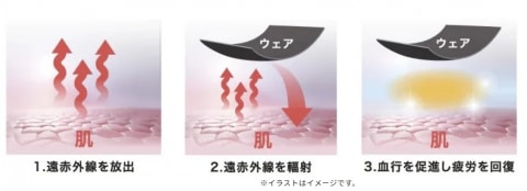 特長は火山灰を練り込んだ生地と鉱石を含んだゴムによる独自の素材設計。着用することで、身体から発生する熱エネルギーを鉱石が吸収し、遠赤外線を輻射(ふくしゃ)することで、血行が促進される仕組み。その結果、着用するだけで筋肉のコリを緩和し、疲労回復をサポートする効果が期待できるという。