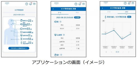 測定する健康データは、脳、心血管、髪、筋骨格、肌、歯の6項目、48種類のカラダ測定年齢。利用料金は12月中までは無料で、2026年1月~3月は1,200円/3カ月。4月以降のサービス内容や価格については現在検討中。