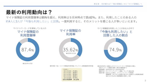 マイナ保険証の利用登録率は9月末時点で85%を超えているが、利用率は35.62%と、登録者と実際の利用者に差はあるのが現状。ただし、対応の医療機関の増加もあり、毎月着実に利用率は伸びているという。また、アンケートでは、約4人に3人が「今後も利用したい」と回答しており、実際の利用者からは評価されているとする。厚生労働省では、マイナ保険証に一本化することで保険証の発行コストなど、年間約100億円前後の削減を見込んでいる。