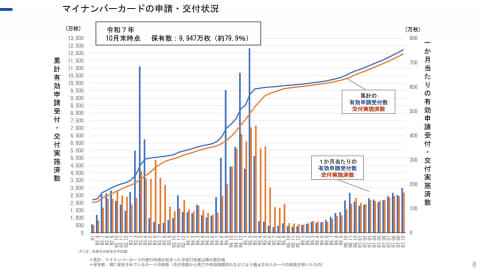 マイナンバーカードの交付枚数は10月末時点で9,947万枚。人口の79.9%が持つカードとなった。25年3月からは運転免許証としても使える「マイナ免許証」がスタートし、10月には「マイナ救急」が全国展開。さらに12月からは「健康保険証」がマイナンバーカードを基本とする仕組みに移行する。
