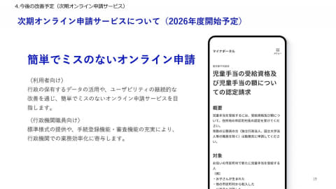 そのほか、26年度中に「お知らせ機能」の改善や、海外からの旅券のオンライン申請に対応予定。また、次期は未定だがオンライン死亡届の提出や、出生・子育て関連手続きのオンライン一括申請などに対応予定としている。