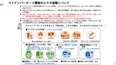 なお、iPhone搭載の「iPhoneのマイナンバーカード」は25年6月にスタートし、利用者も拡大。令和7年度分の確定申告ではiPhoneだけで確定申告可能になる予定。Androidは「スマホ電子証明書」には対応しているものの、氏名・生年月日など券面記載情報の証明には対応しておらず、「26年秋」にiPhone相当の機能実現を目指す。