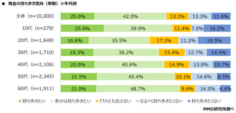 年代別にみると、最も持ち歩きたい意向が高いのは60代の69.8%で、持ち歩きたくない意向が高いのは20代の30.8%になり、20代が持ち歩きたくない割合が高いものの、依然として現金を持ち歩く必要性があると考えている人が多数だった。
