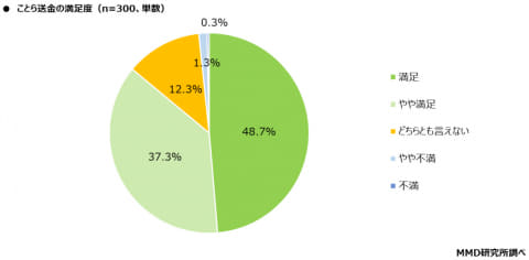 ことら送金の利用満足度は86%で、満足点は「送金手数料が安い・無料(65.1%)」「24時間365日リアルタイムで送金可能(53.9%)」「送金手続きが簡単で便利(49.8%)」となった。