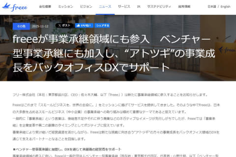 freeeは、新たに中小企業等を対象とした事業承継領域に参入すると発表した。同社はこれまで「スモールビジネスを、世界の主役に。」をミッションに掲げており、日本の大多数を占めるスモールビジネス(中小企業)の事業承継への取り組みは極めて重要なテーマであるとする。