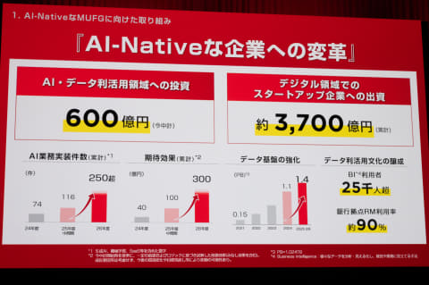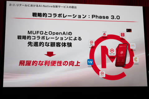 三菱UFJフィナンシャル・グループ(MUFG)は、三菱UFJ銀行がOpenAIと戦略的なコラボレーション契約を締結したと発表し、業務改革や新サービス創出に関するAI戦略を明らかにした。実証を経た“運用段階への移行”と謳い、グループのデジタル基盤の「飛躍的な強化」を掲げる。2026年度にスタートする新デジタルバンクをはじめ、さまざまなサービスでChatGPTと連携し、スローガンとして掲げる「AI-Nativeな企業」への変革を大きく進める。