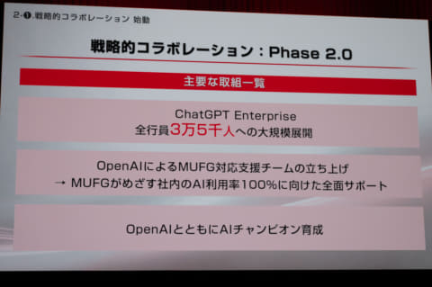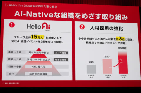 社内にAIの利用を浸透させる取り組みとして、グループ全体の15万人を対象に、全社AI浸透イベントを開催。教育・研修プログラムを三菱UFJ銀行とOpenAIの両社で支援するほか、組織改革に取り組むAI専門人材を育成する。