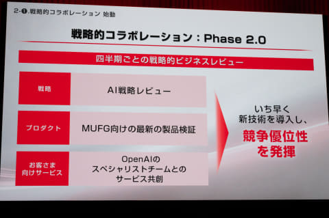 三菱UFJ銀行とOpenAIは2024年10月、共同で業務の高度化・効率化に取り組むと発表しており、幅広く活用できる機会を醸成してきた。今回明らかにされたAI戦略はこの取り組みの成果を踏まえたもので、実証段階から本格的な運用段階への移行と位置付けている。