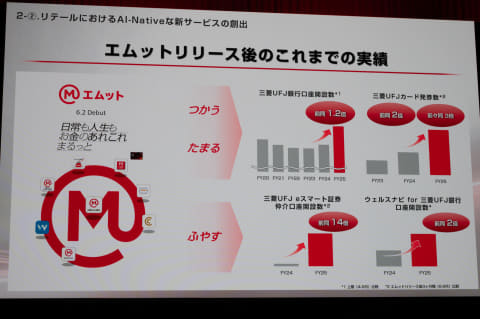 MUFGはリテールサービスの新ブランド「エムット」を6月にスタート。認知や導線が大きく変わったことで、すでに大きな効果が出ていることが明らかにされている。2024年度と比較して、三菱UFJ銀行の口座開設数は1.2倍に拡大。ウェルスナビ for 三菱UFJ銀行の口座開設数は2倍に拡大した。