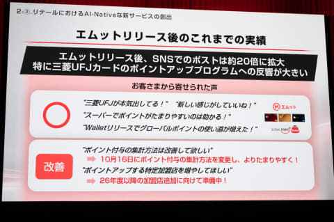 エムットがリリースされた後は特に、三菱UFJカードのポイントプログラムが拡充された点について反響が大きかったという。ポイントがアップする特定加盟店は、スーパーを中心にさらに拡大できるよう準備中としている。